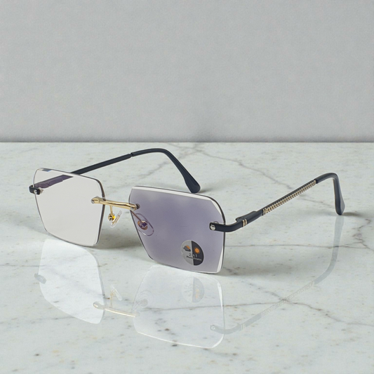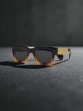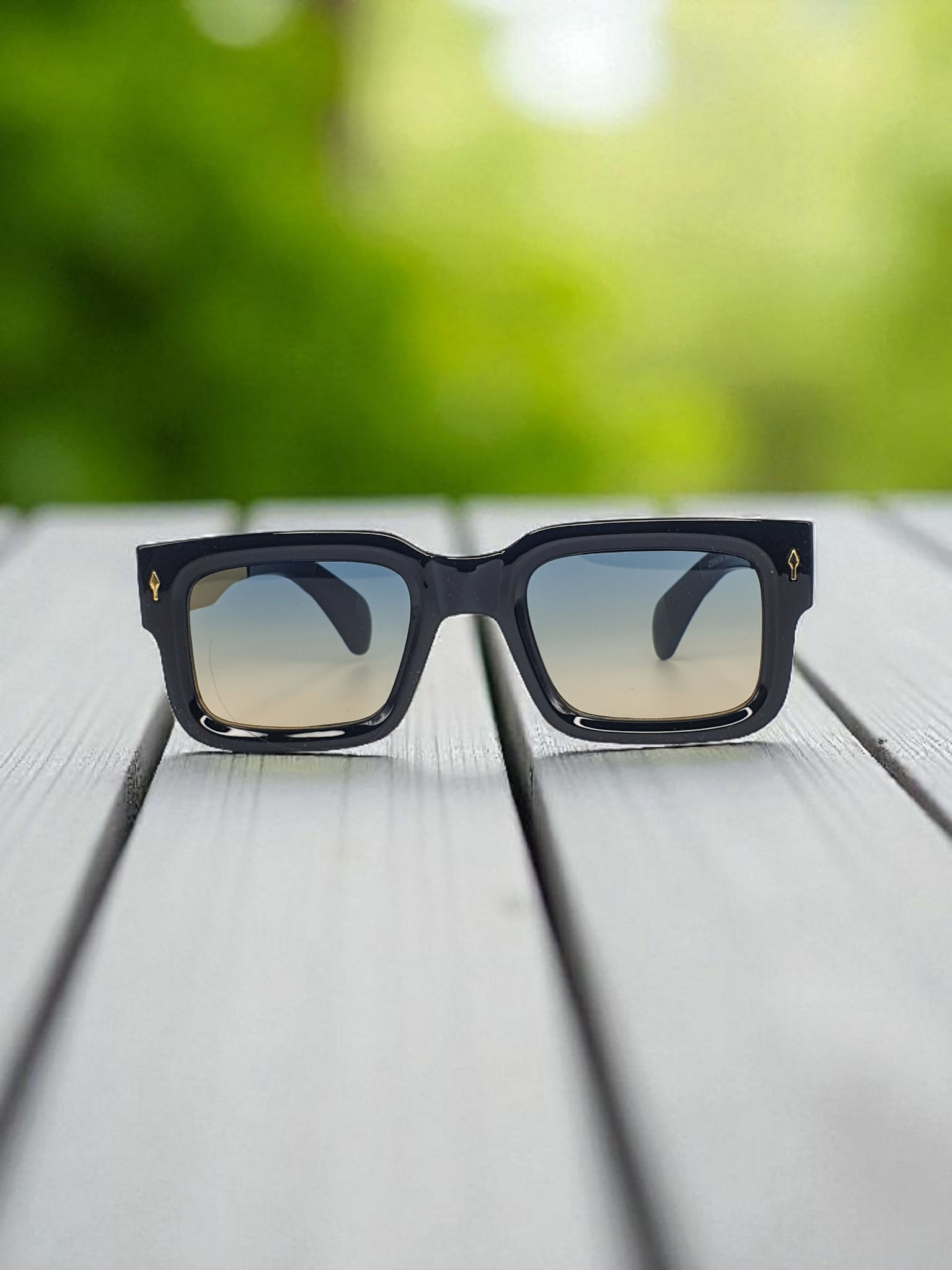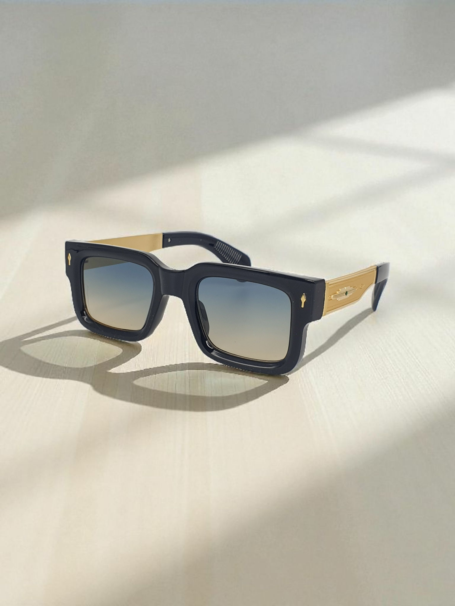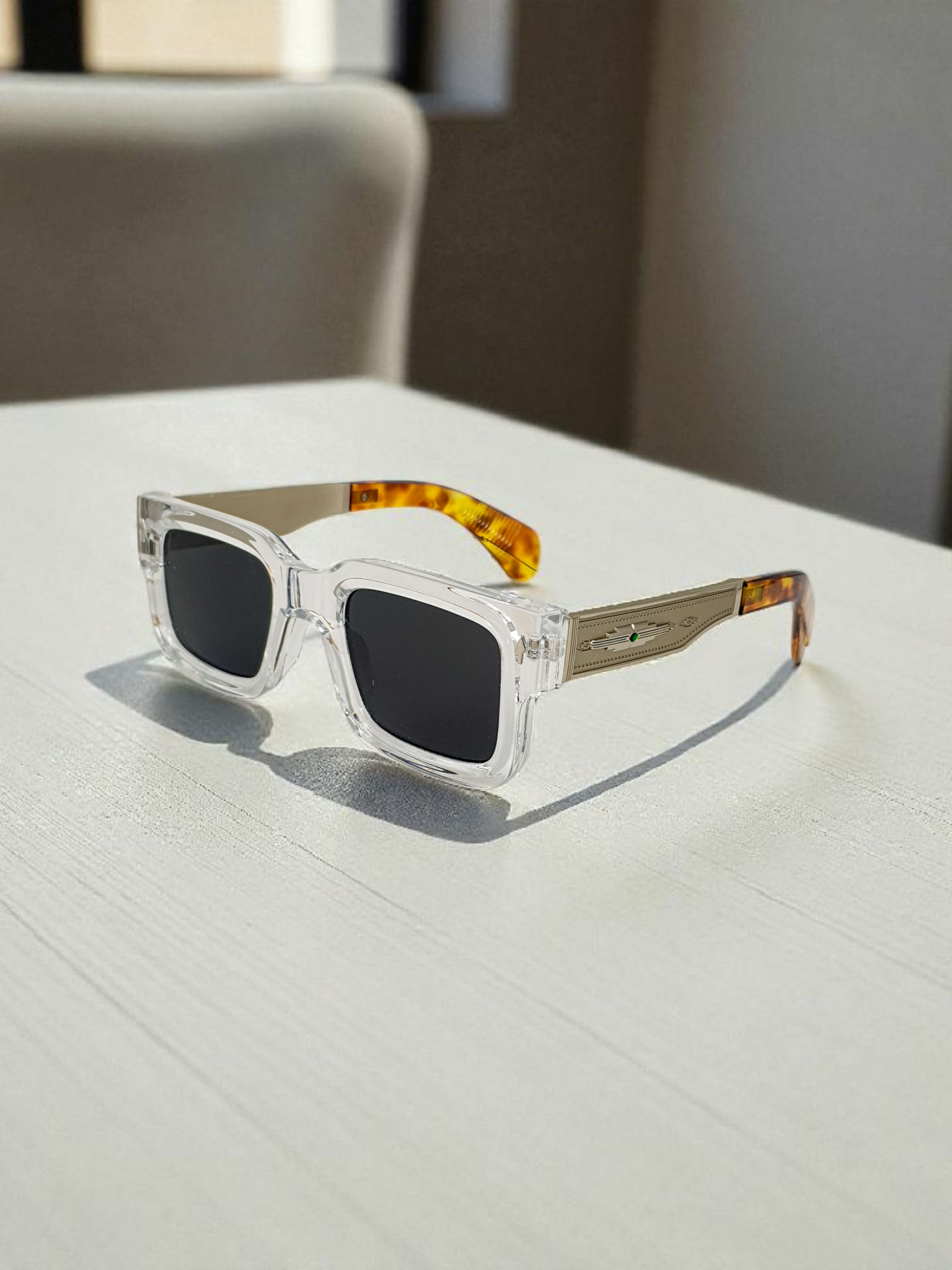 Bold, architectural sunglasses featuring a sculpted square frame, precision gradient lenses, and engraved metal temples. Designed for comfort, durability, and a luxury-forward aesthetic. Bold rectangular frame design offering a strong, structured silhouette. Thick, sculpted front frame crafted for a premium, high-end aesthetic. Wide temples with polished metal panels for a luxury statement look. Signature side gem detail inset into the temple, adding a refined jewelry-like accent. Intricate engraved emblem on each metal temple panel, showcasing craftsmanship and designer detailing. Smooth integrated nose bridge ensuring comfort and a seamless visual flow. Ergonomic temple arms with interior grip texture for a secure,...