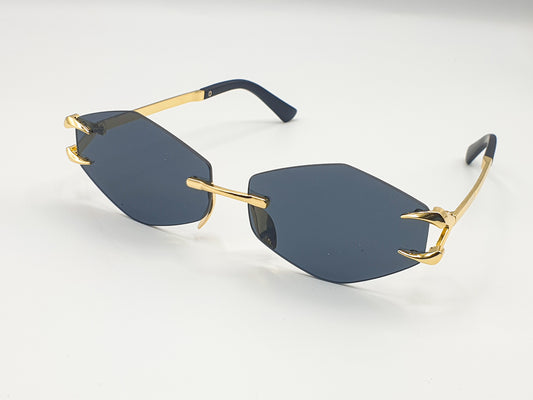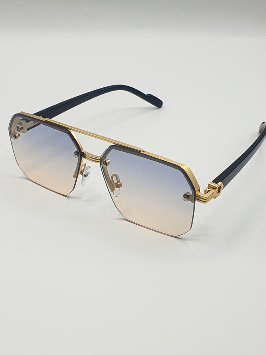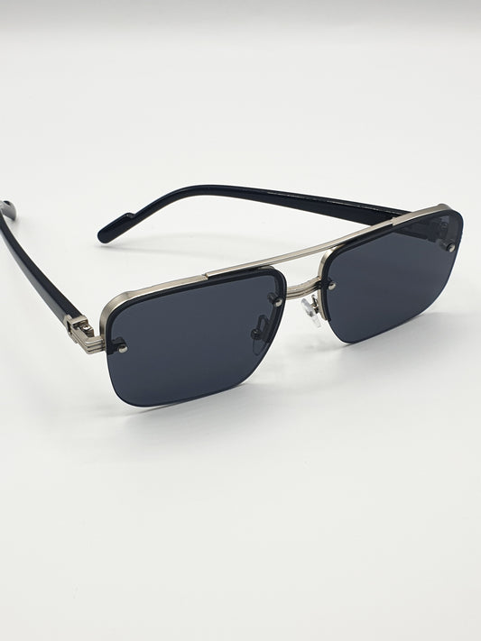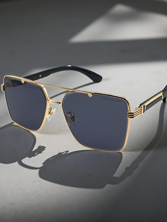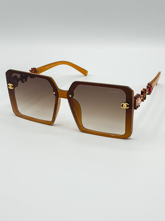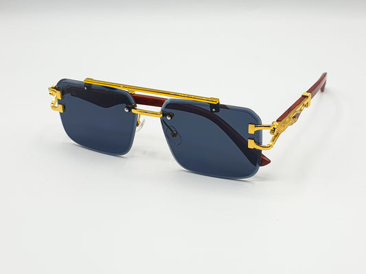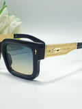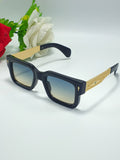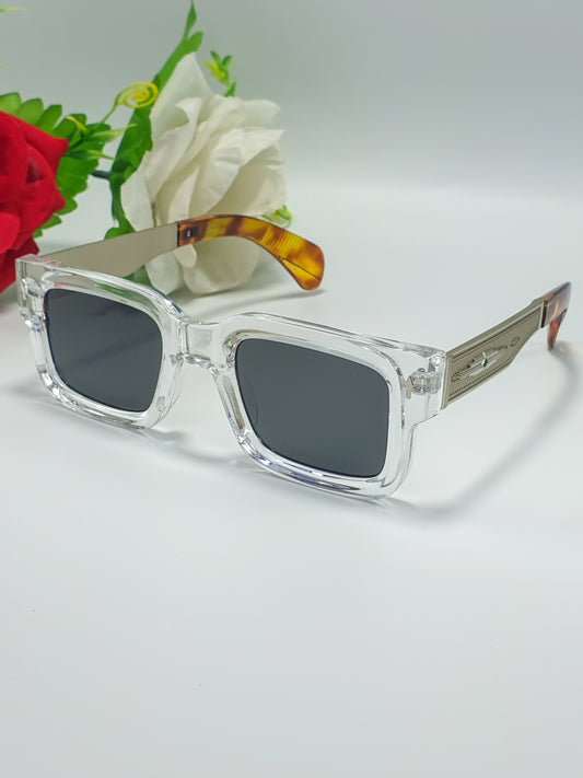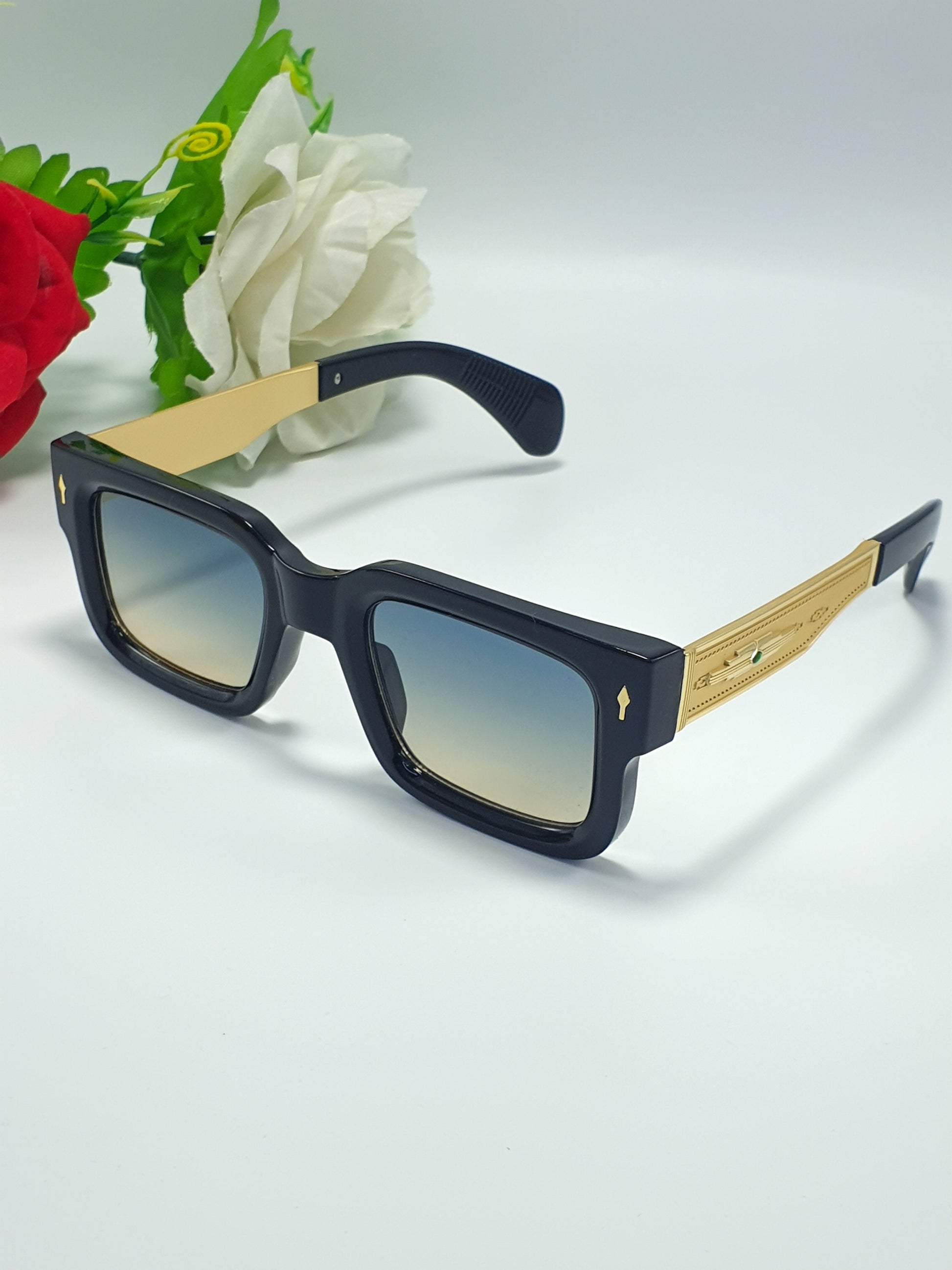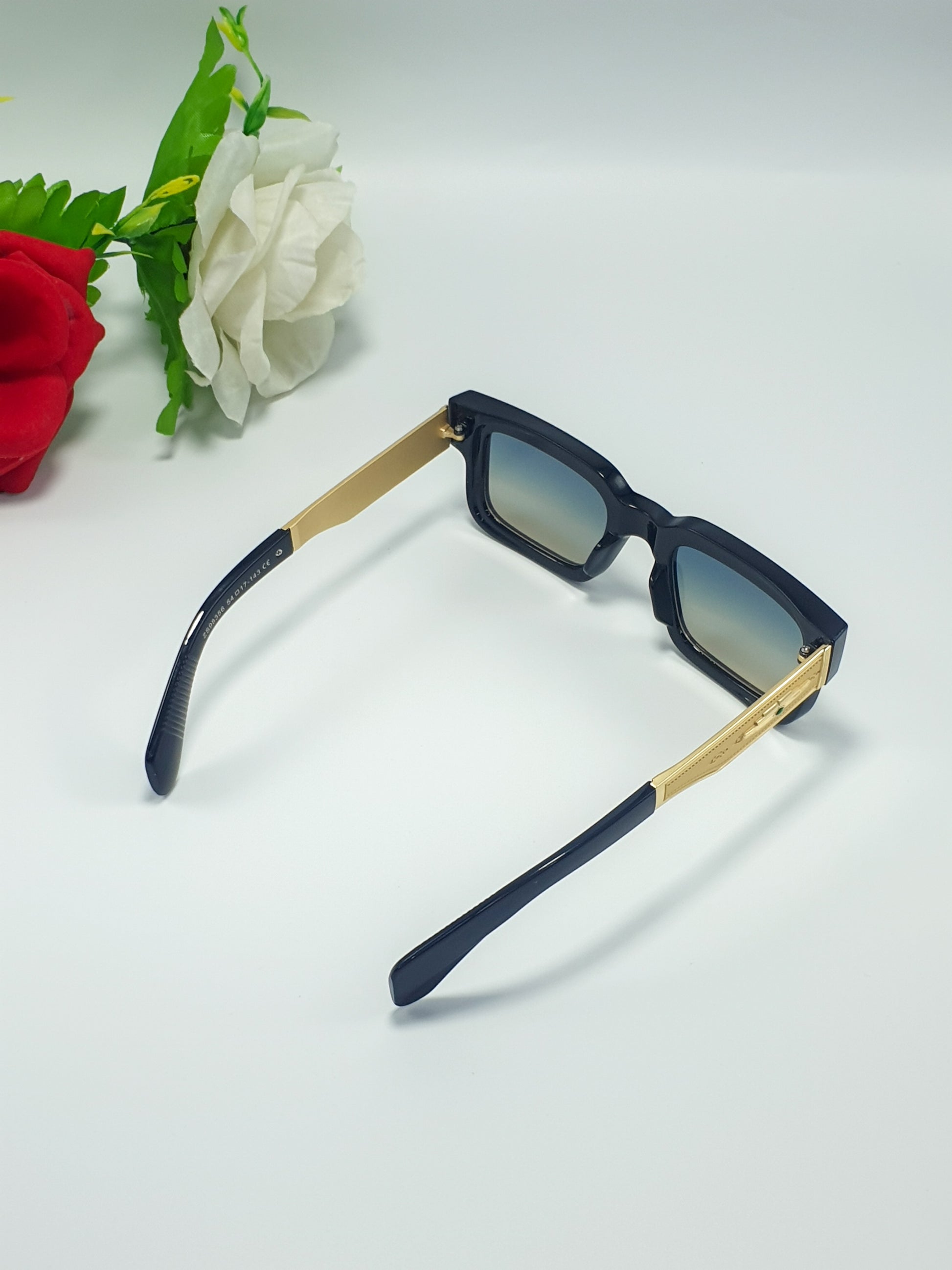 This is a pair of stylish rectangular sunglasses with a bold, structured frame that conveys a contemporary and luxurious design. The temples feature a refined metal detail that enhances their sophisticated appearance. A standout feature is the small green gem delicately set into the temple, adding an elegant touch of distinction. Additionally, the arms are adorned with intricate engraving that showcases fine craftsmanship and attention to detail, giving the sunglasses a premium and distinctive aesthetic.
