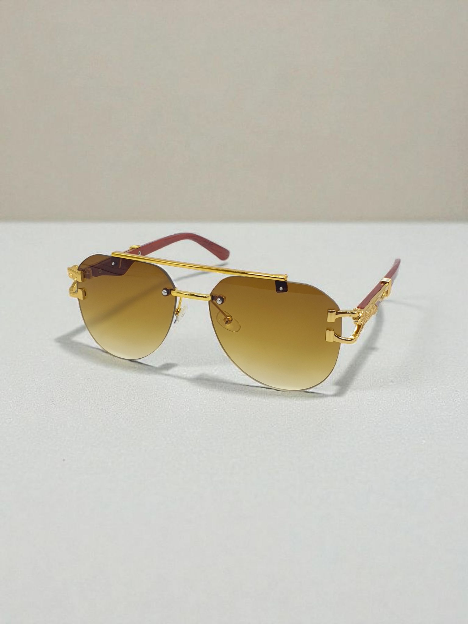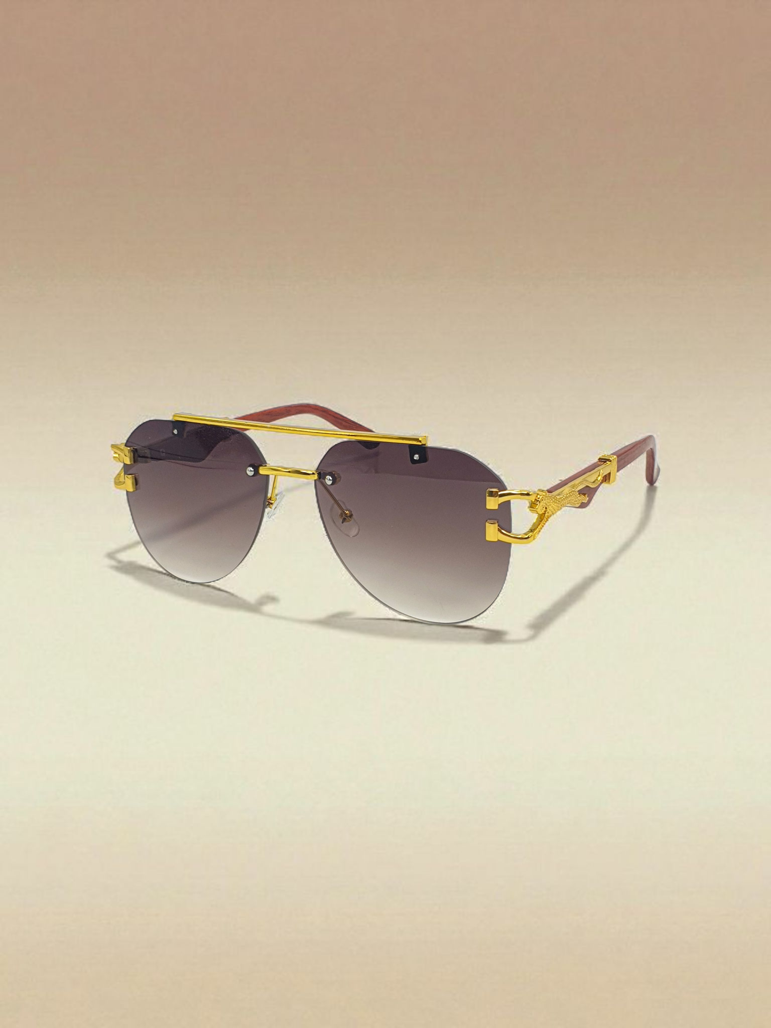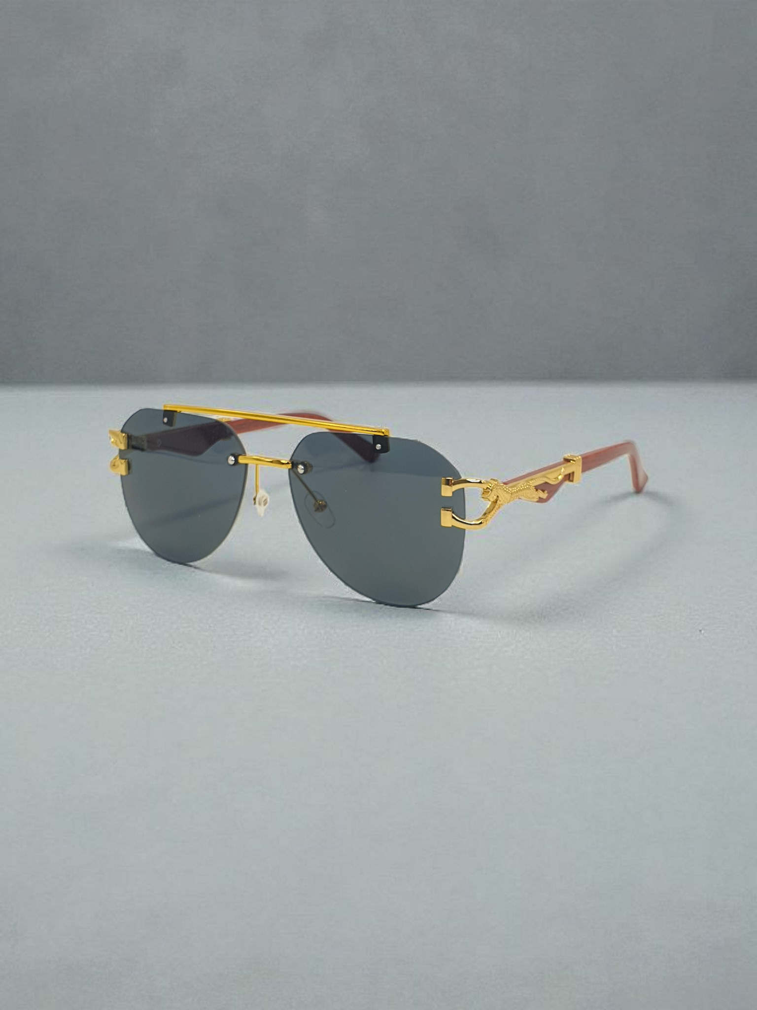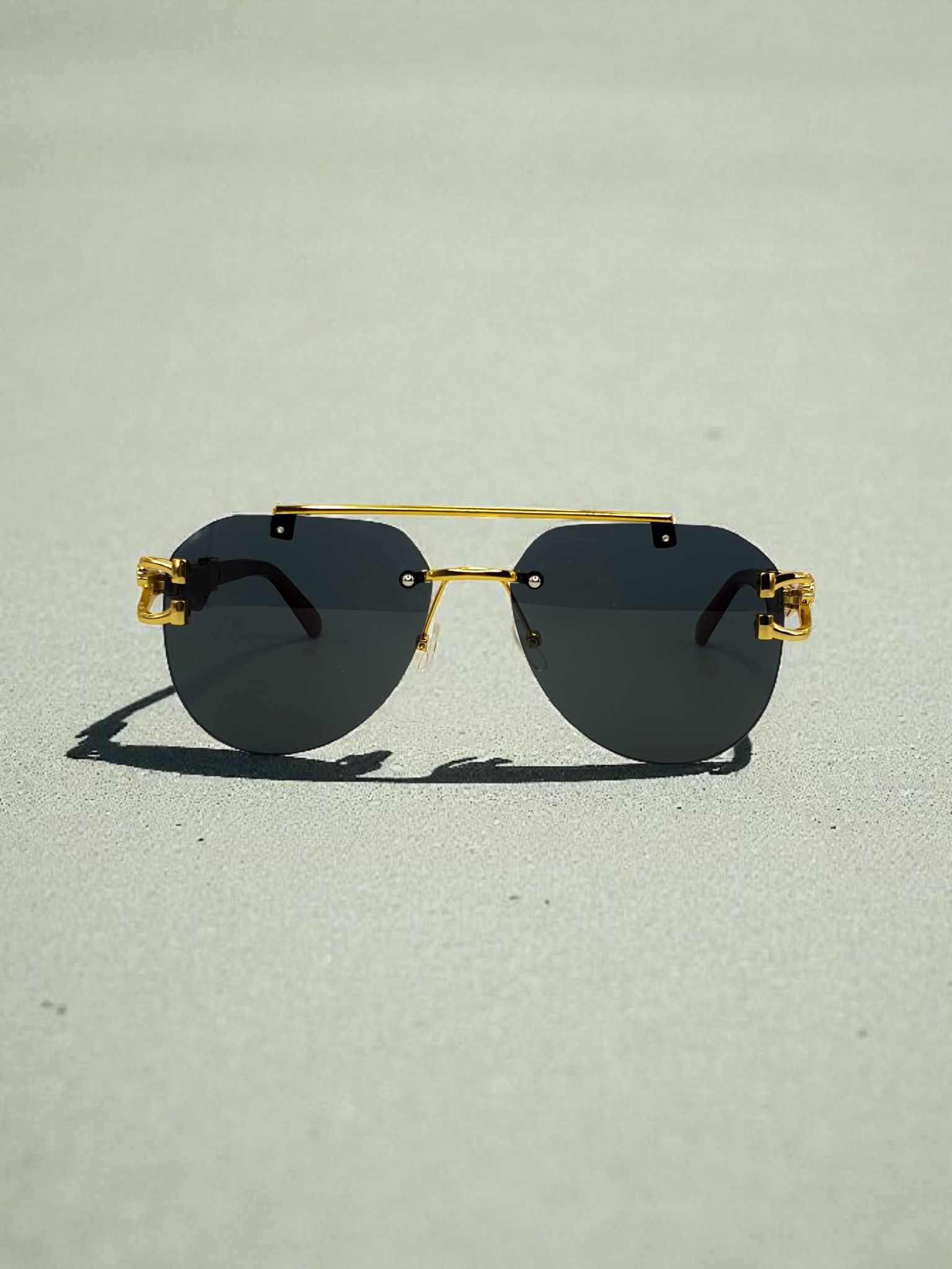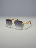 Precision-cut metal accents on the temples, featuring an intricate sculpted emblem