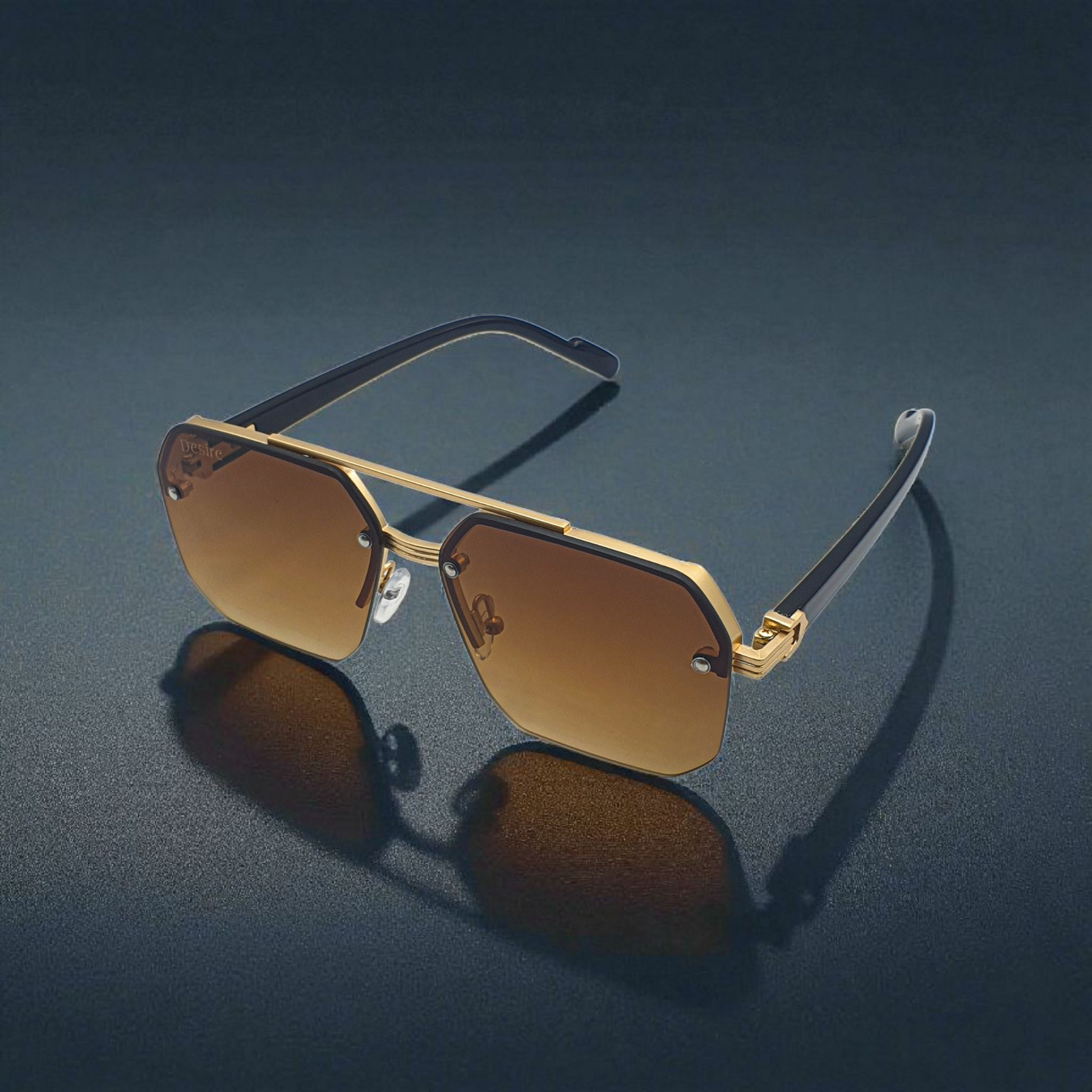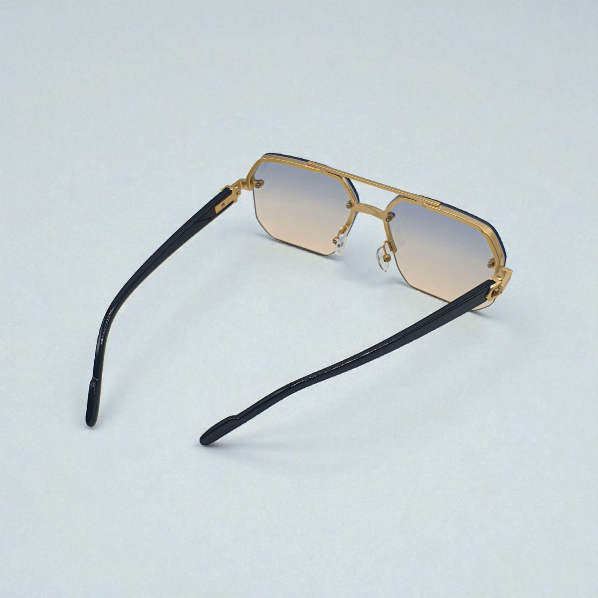 These sunglasses feature a highly contemporary and bold octagonal or hexagonal geometric lens shape, a striking modern take on the classic aviator design. The style is characterized by its sharp angles and floating, rimless bottom edge, creating a sophisticated and architectural look. The prominent gold-tone metal hardware and distinctive logo detailing on the temples suggest a high-end luxury or designer brand association