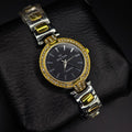 The Timepiece: A sophisticated dual-tone (silver and gold) watch with a striking black dial, and a crystal-encrusted bezel for a touch of brilliance.