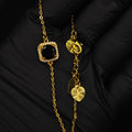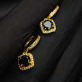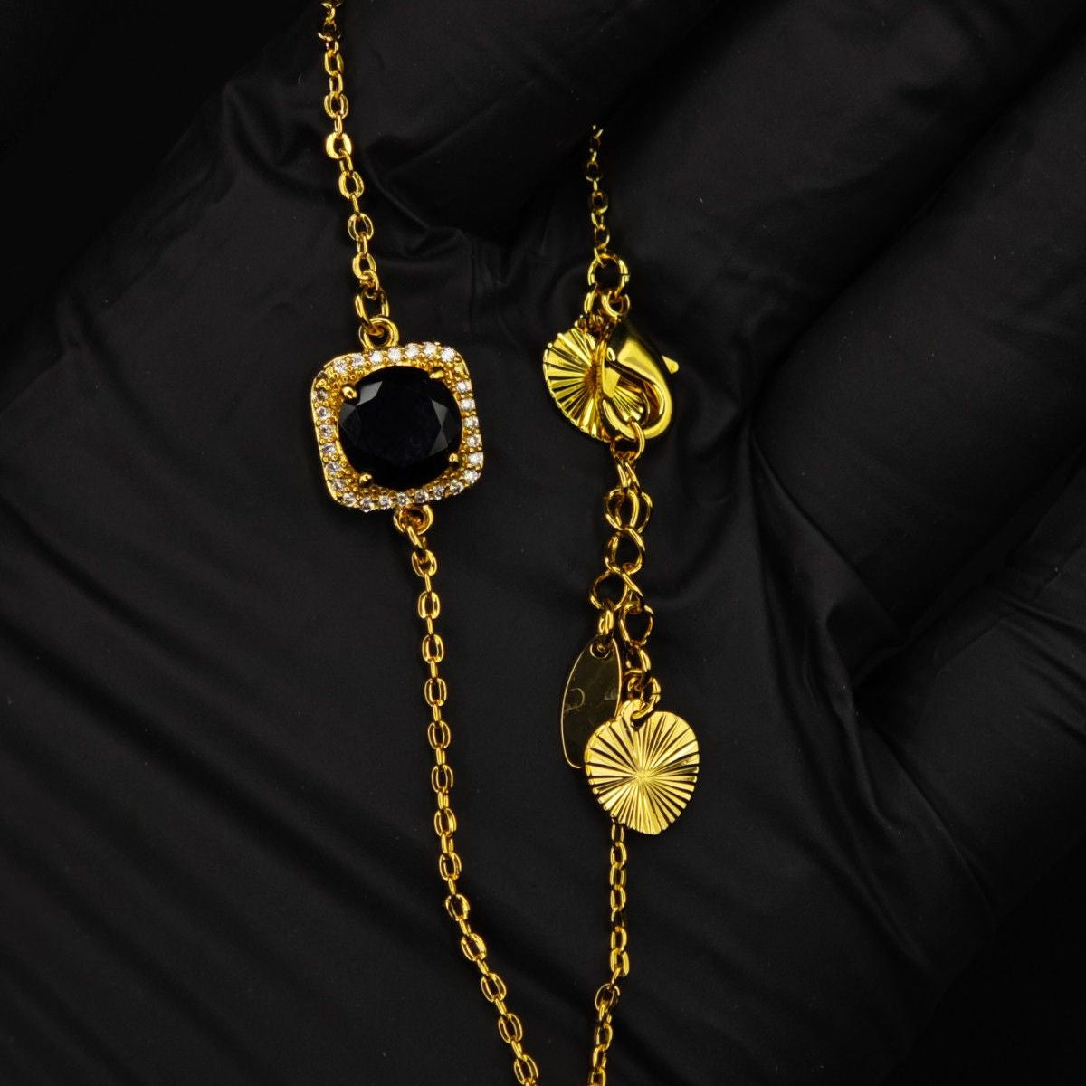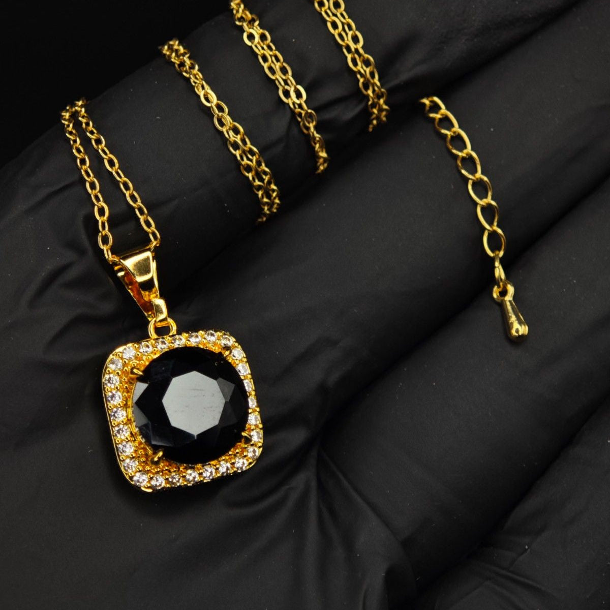 Pendant Necklace: A square-cut, deep black center stone surrounded by a halo of shimmering micro-crystals on a delicate gold-tone chain.
